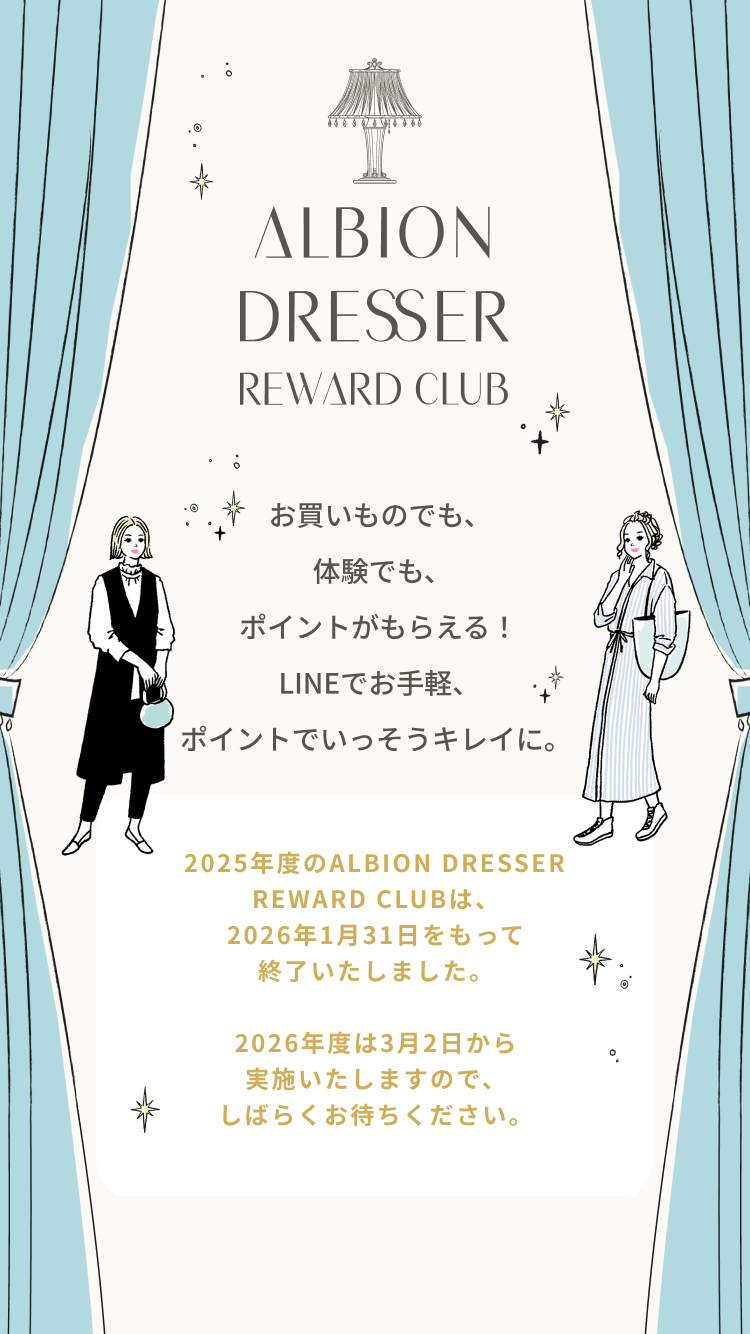 ALBION DRESSER CLUB は2025年度の特典のお渡しを最後に、 ALBION DRESSER REWARD CLUBに リニューアルいたしました。 店舗や企画ごとにお渡ししていたギフトを 「ポイント」に一元化し、 LINEに集約することで、よりお使いいただきやすくいたします。