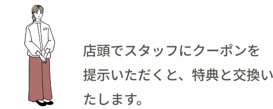 ※「クーポン使用」ボタンは店頭スタッフ同席時に押してください。店頭以外で押された場合は無効となり、特典との交換ができません。